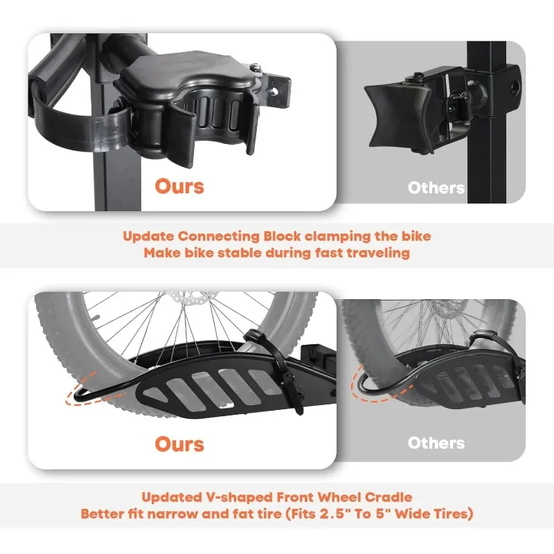 Enhanced Compatibility & Stability: Our updated 2-inch rack now includes a V-shaped front wheel cradle, accommodating a variety of tire sizes. The vertical rod's connecting block features a semi-enclosed design. With its sturdy bolt system and shock-absorbing threads, this hitch rack ensures unparalleled stability on any terrain. Refer to our easy-to-follow manual or download the E-manual for installation.