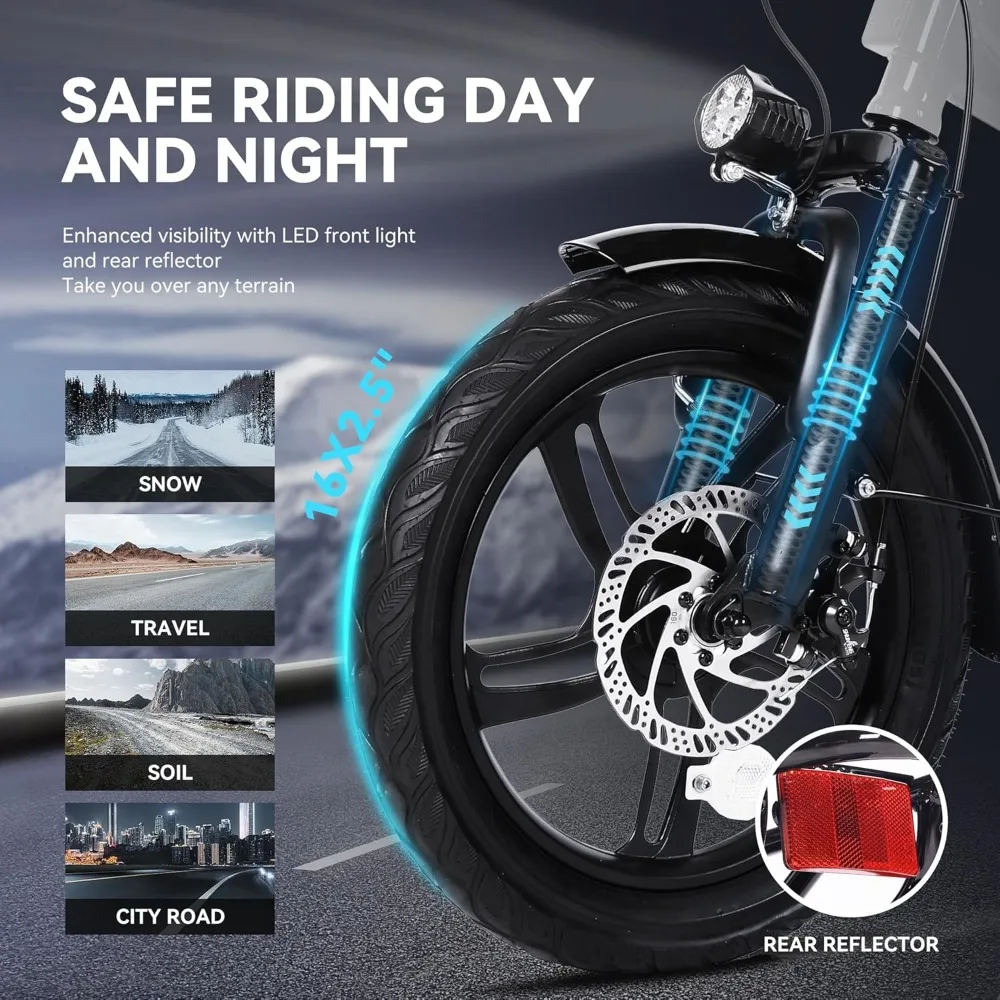 【Mini Ebike, Astonishing Power】Equipped with a removable 36V 280.8Wh battery and 16" tires, it offers up to 30 miles of range and fast charged in 4-5 hours. UL2849 certified with BMS safety protection, waterproof, shockproof design, greatly increases safety and lifespan of the battery