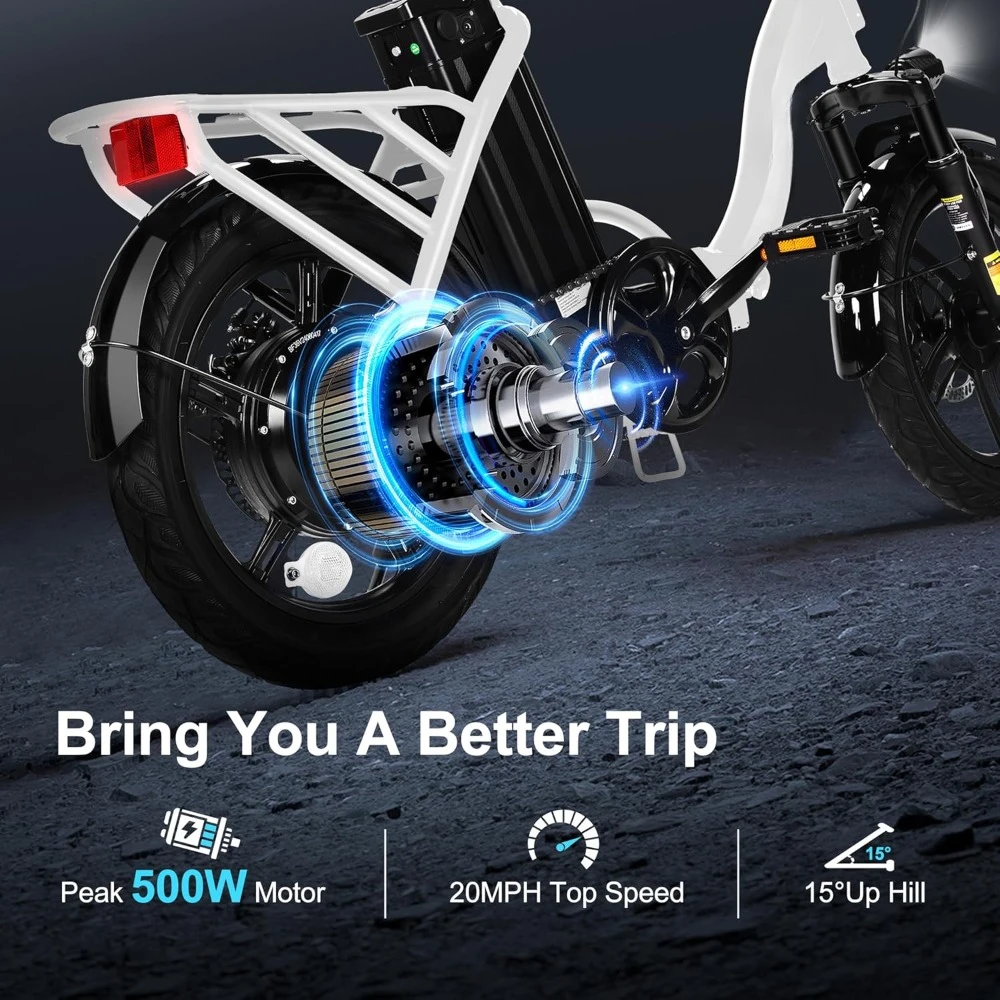 【P500W Powerful Motor】The electric bike is equipped with a 350W motor, with a peak power of 500W. Smart, efficient, and safe are the core features of the motor. It reaches up to 20mph in electric mode. Enjoy the convenience of three riding modes: manual, pedal assist, and pure electric, providing enough power for your daily travel and experience. It can take you over any terrain, from city streets to off-road trails