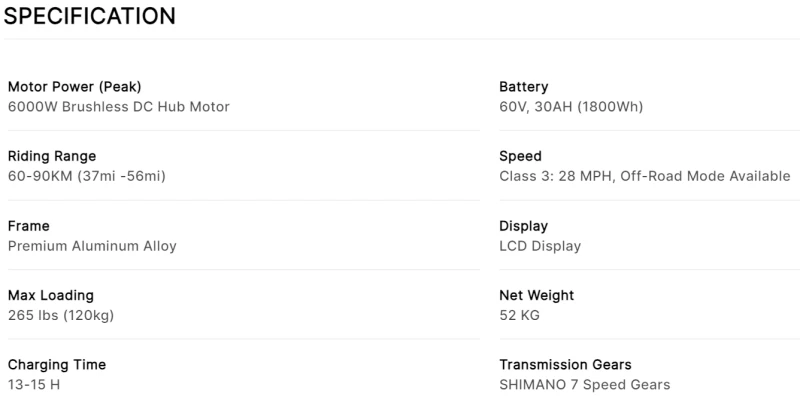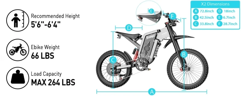 Charger Specification: Output: 67.2V, 2A; Input: 100-240V, 50/60Hz